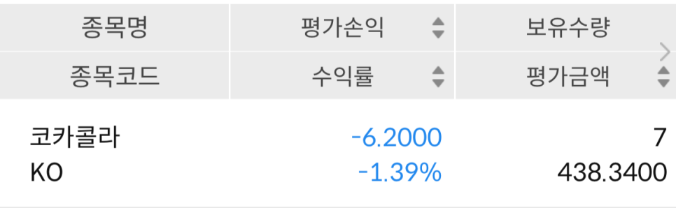 2024년 12월 27일 기준으로 7주를 매수했습니다. 물론 제 시드가 적어서 귀여운 7주를 매수했죠. 현재는 주가가 약간 하락해서 -2.93%입니다. 하지만 코카콜라는 배당금도 주는 안정적인 회사이니, 이자 받는 적금처럼 생각하고 계속 조금씩 매수할 예정입니다. 그리고 사실 결혼을 준비하고 있어서, 매수할 수 있는 자금이 여유롭지 않지만, 남는 돈으로 조금씩 투자하려고 합니다.